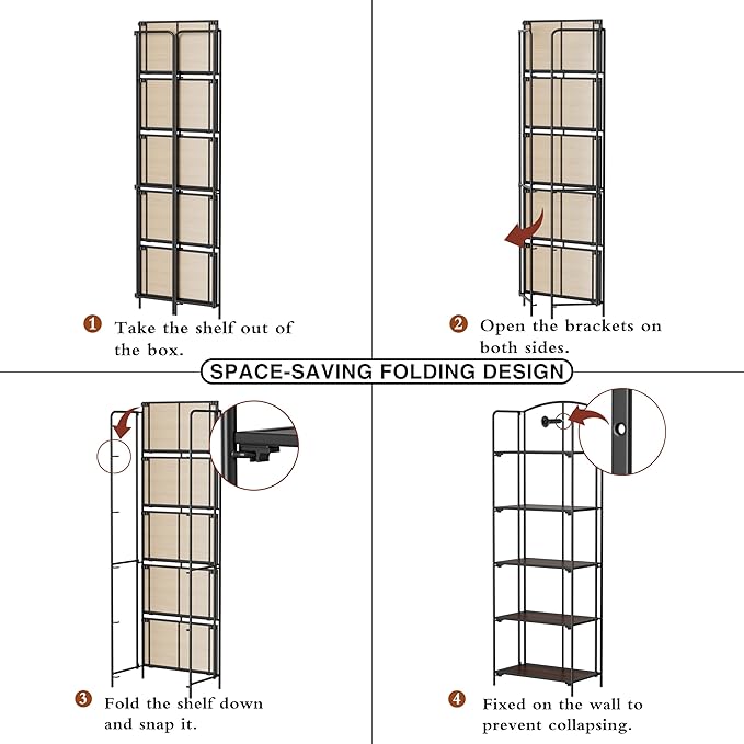 Crofy No Assembly Folding Bookshelf for Living Room, 5 Tier Black Collapsible Book Shelf for Home Office, Portable Bookcase Storage Organizer