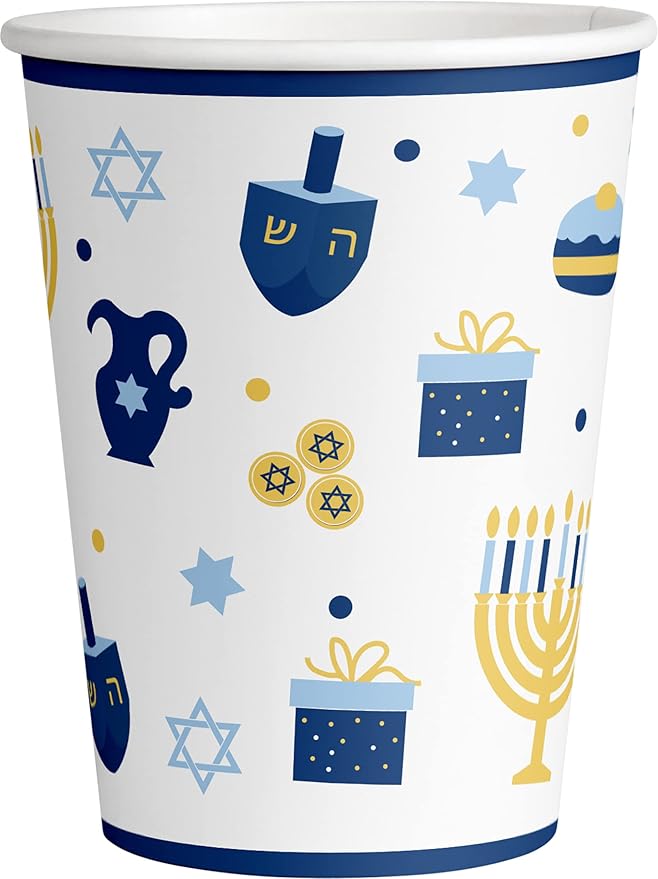 Set the foundation for a celebratory feast with this Hanukkah party tableware set that contains 20 units each of the following: 9" dinner paper plates, 7” dessert plates, 6.5” luncheon napkins and 9 oz paper cups. In traditional blue and white colors, the entire pack features Hanukkah essentials such as Menorahs, Dreidels, Sufganiyot and much more!