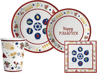 Set the foundation for Passover Seder with this Passover party tableware set that contains 20 units each of the following: 9" dinner paper plates, 7” dessert plates, 6.5” luncheon napkins and 9 oz paper cups. The entire pack features illustrations of Passover essentials such as Matzah, Karpas, Maror and much more!