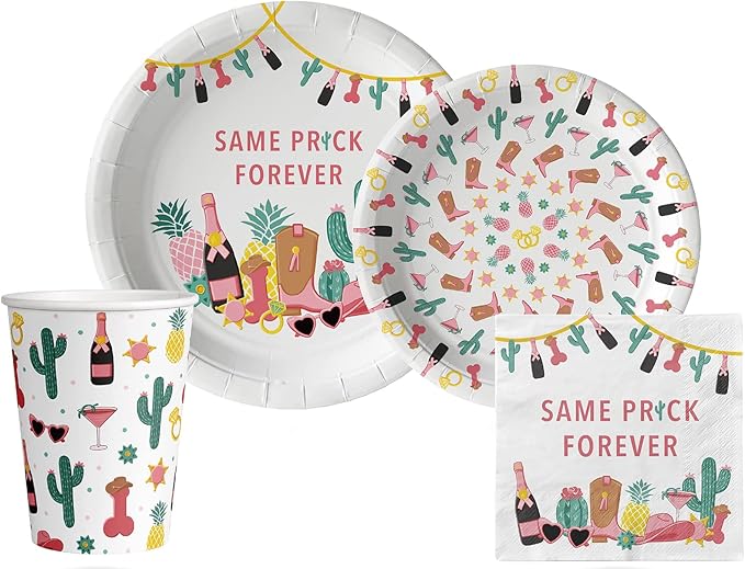 Bachelorette "Same Prick Forever" Tableware Pack: Disposable Paper Plates, Napkins and Cups Set for 20