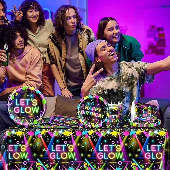 Neon Party Supplies,142Pcs Let Glow Party Decorations Including Disposable Paper Plates,Cups,Tablecloths, Glow in the Dark Theme Decoration for Birthday Baby Shower Party