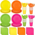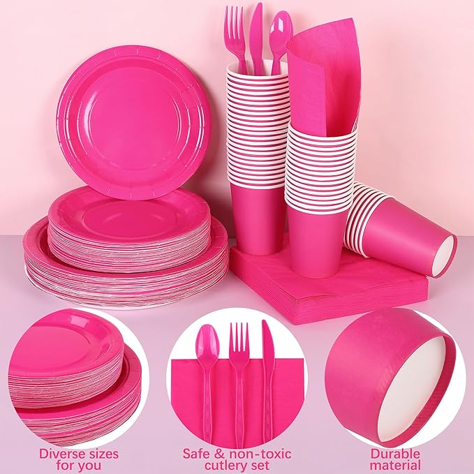 durony 350 Pieces Hot Pink Paper Dinnerware Set 7 Inch 9 Inch Disposable Dinner Plates Serve 50 Guests Paper Cup Cutlery Napkins Solid Color Party Supplies for Birthday Wedding Party Family Picnic