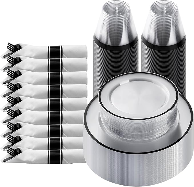 Goodluck 175 Piece Black Plastic Dinnerware Set for Party, Clear Disposable Plates for 25 Guests, Include: 25 Dinner Plastic Plates, 25 Dessert Plates, 25 Pre Rolled Napkins with Cutlery Set, 25 Cups