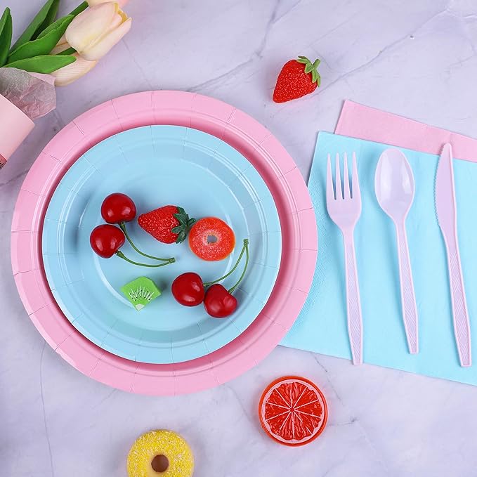 durony 350 Pieces Baby Gender Reveal Party Supplies Light Pink Light Blue Paper Plates Serve 50 Guests Boy or Girl Gender Reveal Plates Napkins Paper Cup Cutlery for 1st Birthday and Baby Shower Decor