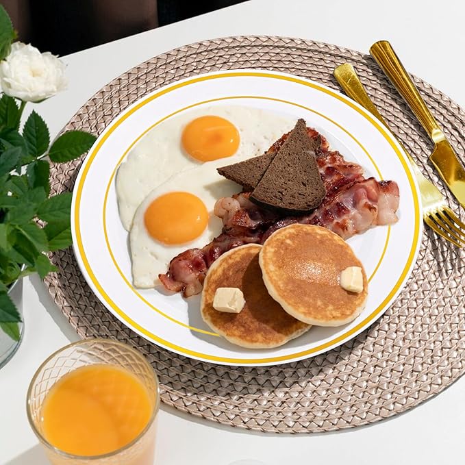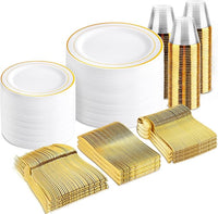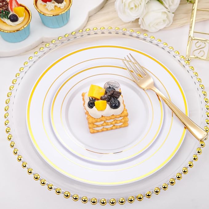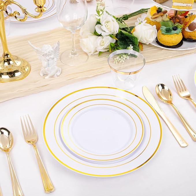 bUCLA 600Pcs Gold Dinnerware Set for 100 Guests - White and Gold Plastic Plates Disposable for party Include 100 Dinner&100 Dessert Plates,100 Cups,100 Forks,100 Spoons,100 Knives