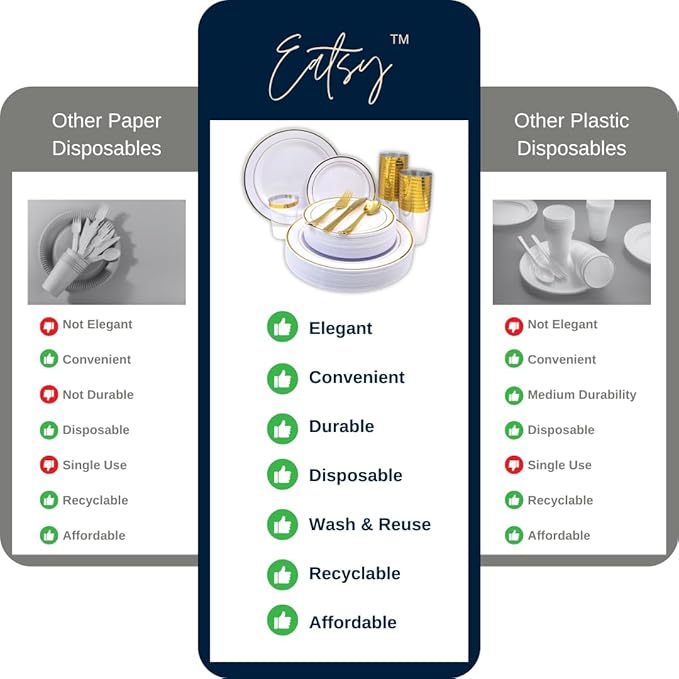 Tableware Dinnerware Set, Premium Heavyweight, Reusable or Disposable Party Plates, Includes Dinner Plate, Dessert Plate, Cutlery, and Cup (Gold, 150-Piece Set, Serves 25 Guests)