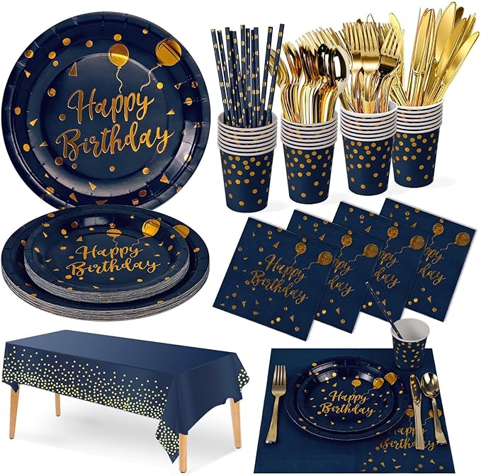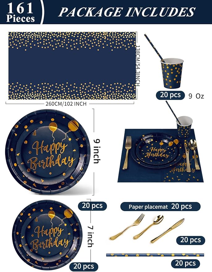 Birthday Party Tableware, 161 Pieces Navy Blue Gold Party Supplies, Party Dinnerware Sets Include Paper Plates Napkins Cups Silverware, for Shower Engagement Parties Decoration -20 Serves