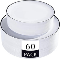 LIYH 60 Pcs White Plastic Plates Disposable for Party Black Plastic Disposable Heavy Duty Party Wedding Plates Including 30 Dinner Plate 10.25” & 30 Dessert Plate 7.5"