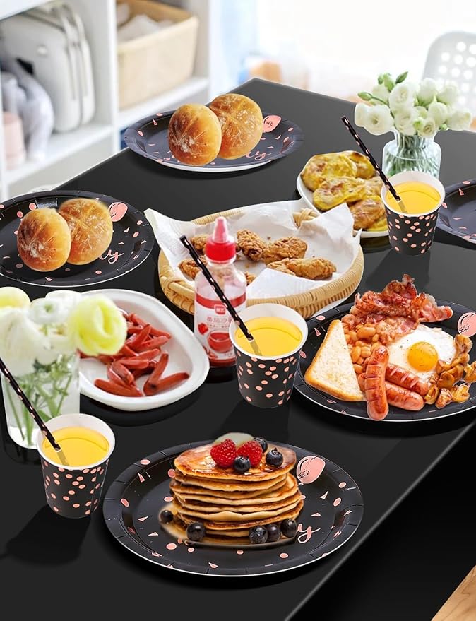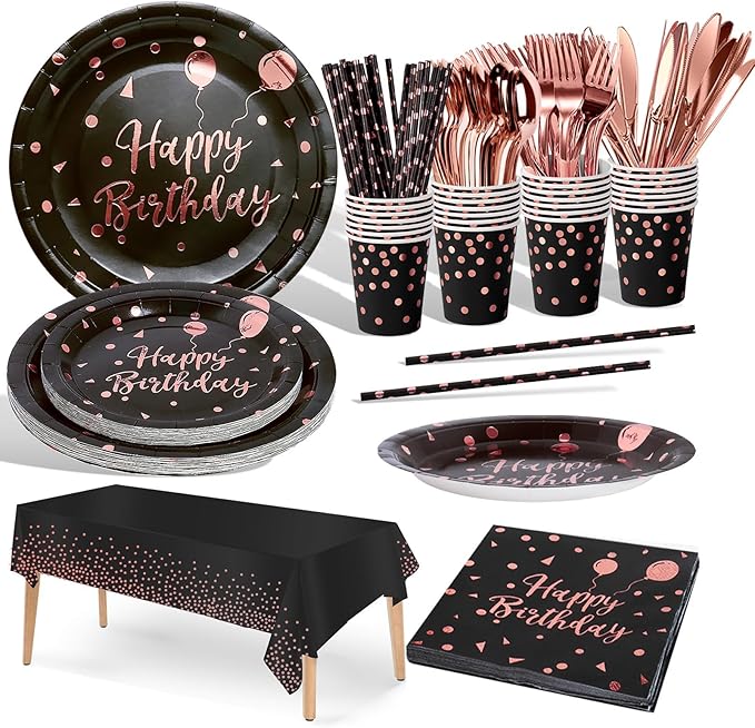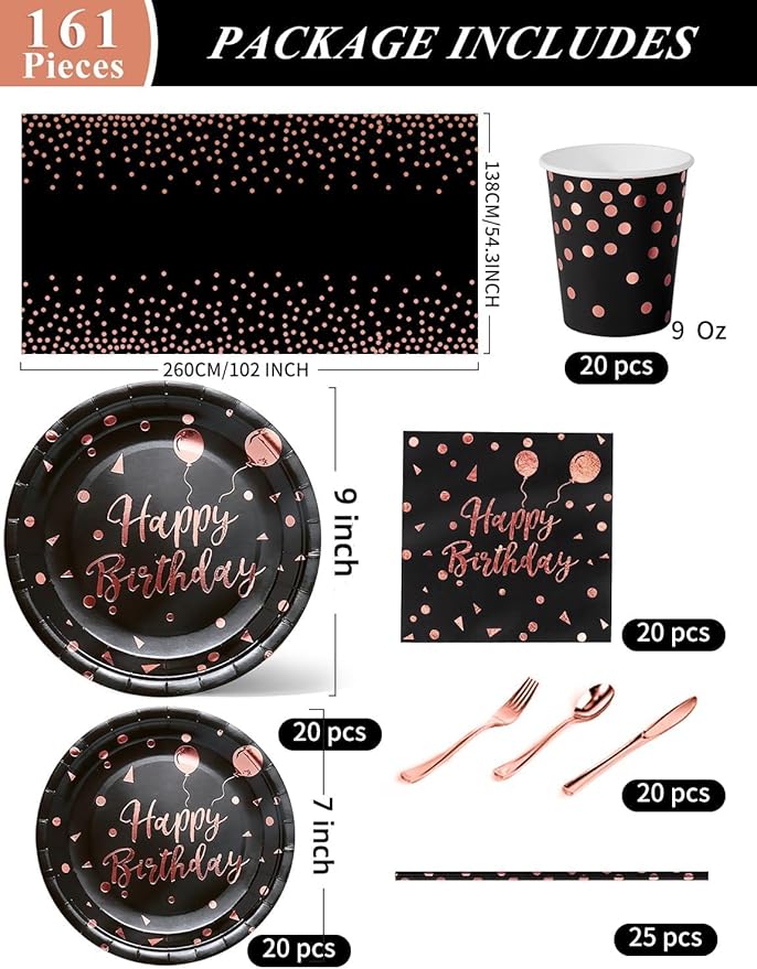 Birthday Party Tableware, 161 Pieces Black and Rosegold Party Supplies, Party Dinnerware Sets Include Paper Plates Napkins Cups Silverware, for Shower Engagement Parties Decoration -20 Serves
