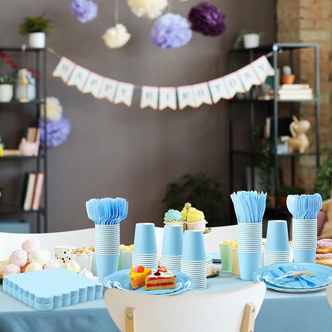 350 Pcs Baby Blue Plates and Napkins, 50 Guest Spring Party Supplies Include Scalloped Paper Plates Napkins Cups Plastic Spoons Forks Knives Disposable Tableware Set for Baby Shower