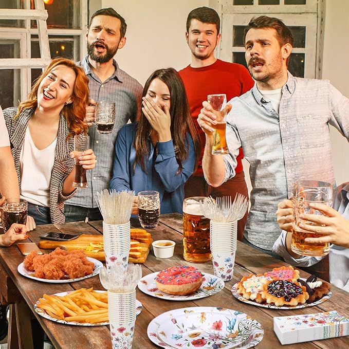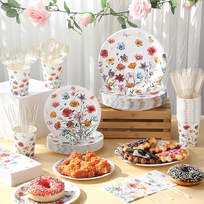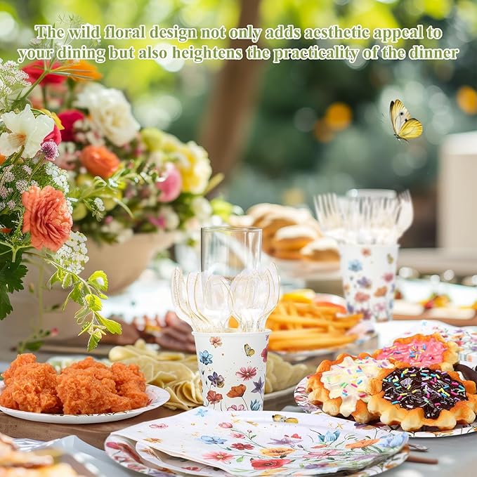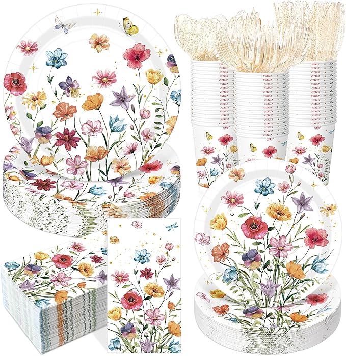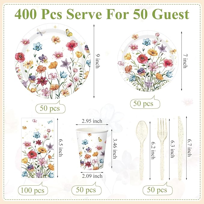 400 Pcs Wild Floral Disposable Paper Plates Napkins Cups Serve 50 Watercolor Floral Tableware Set for Spring Wedding Tea Party Decoration Bridal Shower Baby Shower(Cute Color,Novel Style)