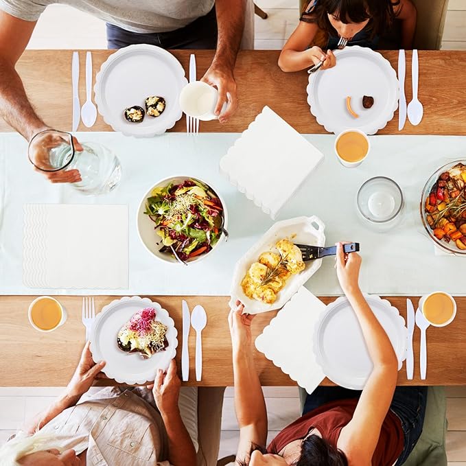 350 Pcs White Plates and Napkins, 50 Guest White Party Supplies Include Scalloped Paper Plates Napkins Cups Plastic Spoons Forks Knives Disposable Tableware Set for Weeding Bridal Baby Shower
