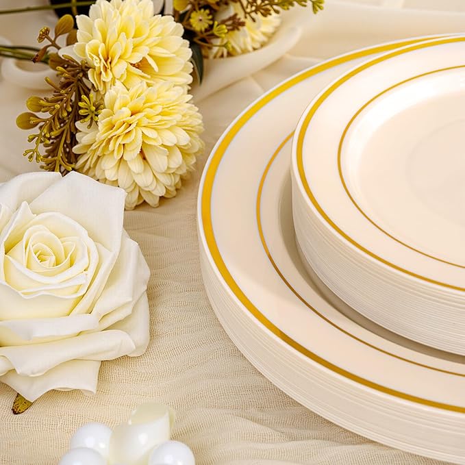 I00000 200 Pcs Gold and Ivory Plastic Plates, Ivory Disposable Party Plates Include 100 Dinner Plate 10’’ and 100 Plastic Dessert Plate 7’’ Perfect for Birthday, Party & Wedding