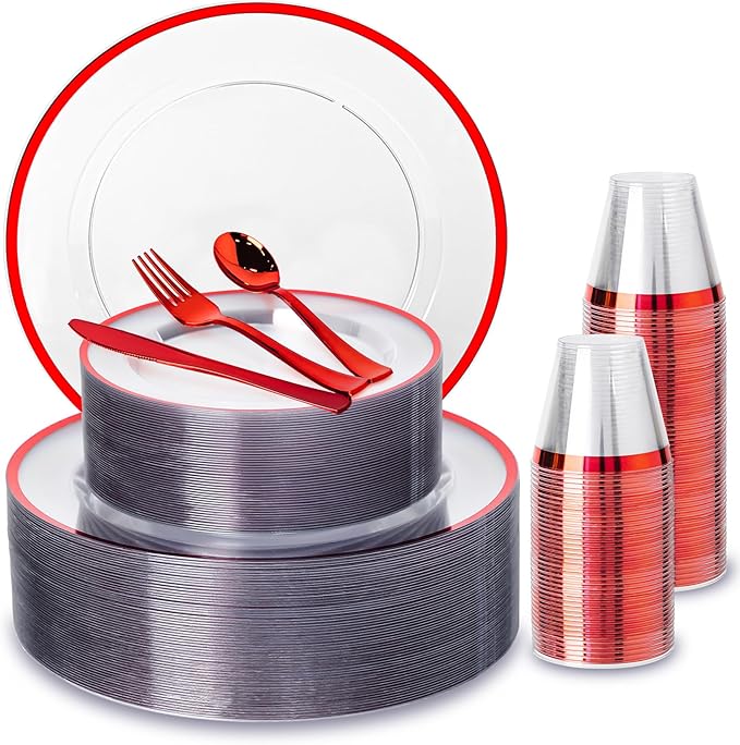 N9R 600PCS Red Disposable Plates, Heavy Duty Plastic Dinnerware Set for 100 Guests Includes 100 Dinner & Dessert Plates, Cups, Spoons, Forks, and Knives, Perfect for Parties, Weddings,and Daily Use