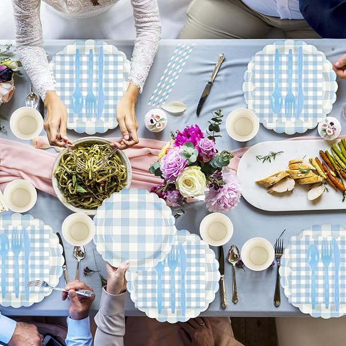 400PCS Light Blue Gingham Party Supplies, Scalloped Disposable Tableware Set Includes Paper Plates Napkins Cups Straws Forks Knives Spoons for Baby Shower Birthday Wedding Decorations, Serve 50