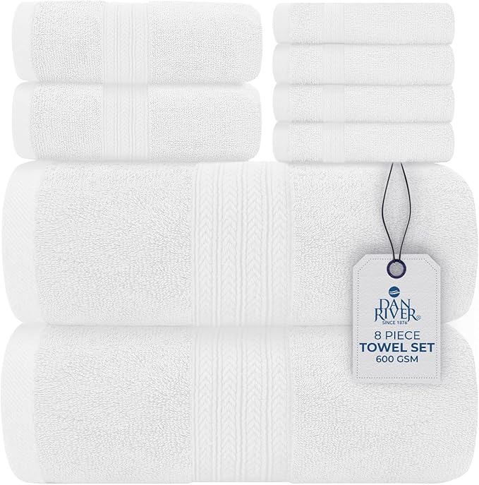 DAN RIVER 8 PC Luxury Bath Towels for Bathroom, 2 Bath, 2 Hand, and 4 Wash Cloths, 600 GSM 100% Ring Spun Cotton Towel Set, Highly Absorbent, Gym, Hotel, and Spa, White