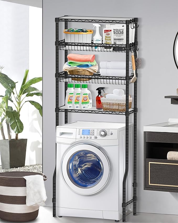 Bathroom Organizer Over The Toilet Storage, 4-Tier Metal Bathroom Over Toilet Storage Shelf Rack Freestanding Space Saver with Adjustable Shelves and Baskets, Black