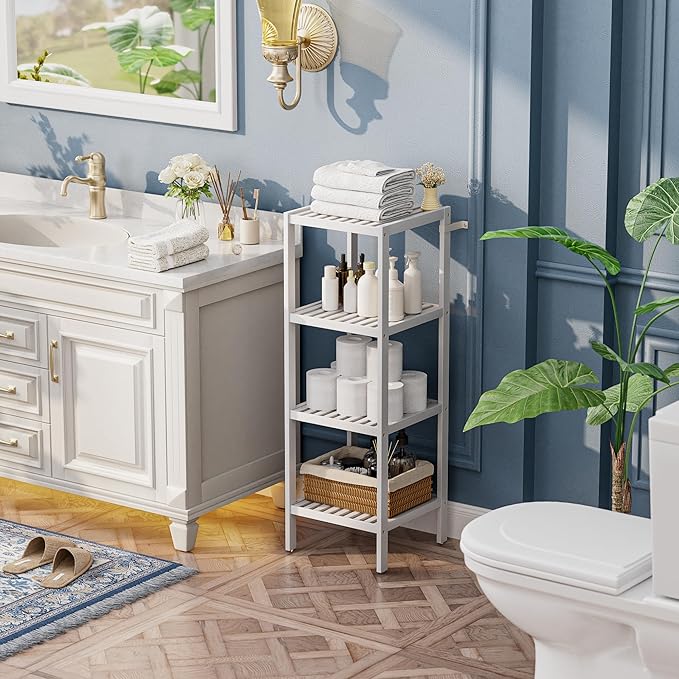 SMIBUY Bathroom Storage Shelf, 4-Tier Bamboo Rack Organizer, Multifunctional Shelving Unit for Living Room Bedroom Kitchen (White)