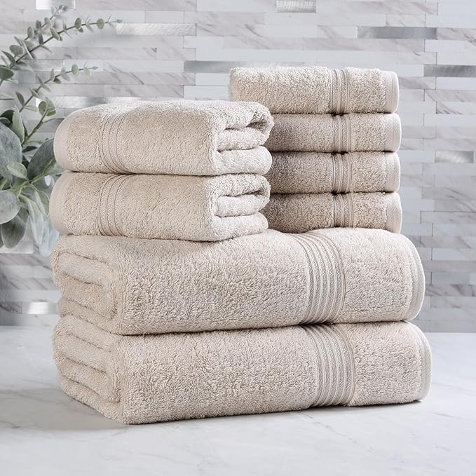 Superior Egyptian Cotton 8-Piece Towel Set, Assorted Towels for Home Bathroom, Master, Guest Bath, Decor Essentials, Includes 2 Bath, 2 Hand, 4 Face Towels/Washcloths, Quick Dry, Absorbent, Stone