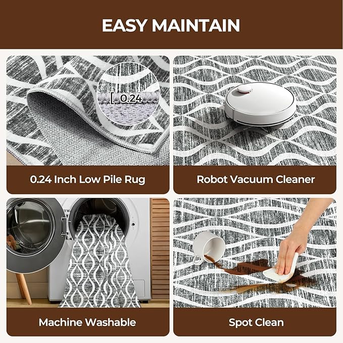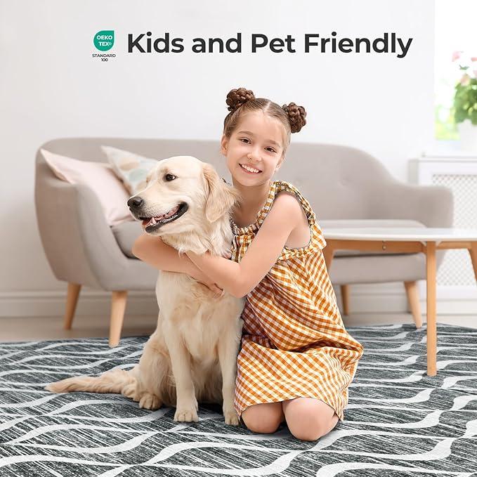 WITSHOCK 7x9 Dark Grey Living Room Rug - Washable Boho Soft Modern Geometric Low Pile Print Pattern Large Thin Indoor Rug for Bedroom Dining Room, Carpet for Nursery Playroom Decor, Eco-Friendly