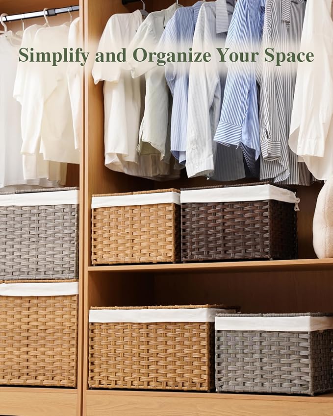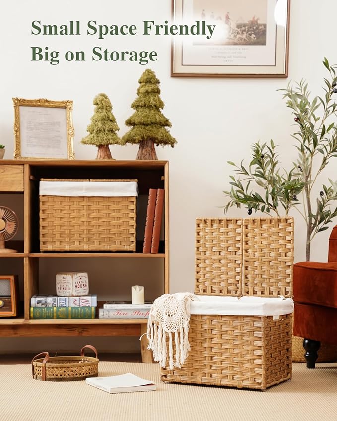 Storage Basket with Lid Woven Wicker Baskets with 2 Separate Lid, 9.2 Gallon (35 L) Wicker Storage Bins with Handles, Foldable and 2 Removable Liner Bags for Bedroom, Laundry Room Natural