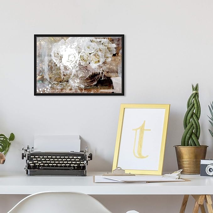 The Oliver Gal Artist Co. Floral and Botanical Framed Wall Art Canvas Prints 'Serving Roses' Florals, White/Gold, 15" x 10"