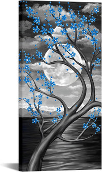 KREATIVE ARTS Blue Flower Tree Wall Art for Bedroom Cherry Blossom Tree in Full Moon Night Landscape Canvas Prints Artwork for Home Wall Decoration Ready to Hang Vertical 20x40inch (Blue)