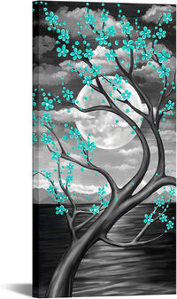 KREATIVE ARTS Teal Flower Tree Wall Art for Bedroom Cherry Blossom Tree in Full Moon Night Landscape Canvas Prints Artwork for Home Wall Decoration Ready to Hang Vertical 20x40inch (Green)