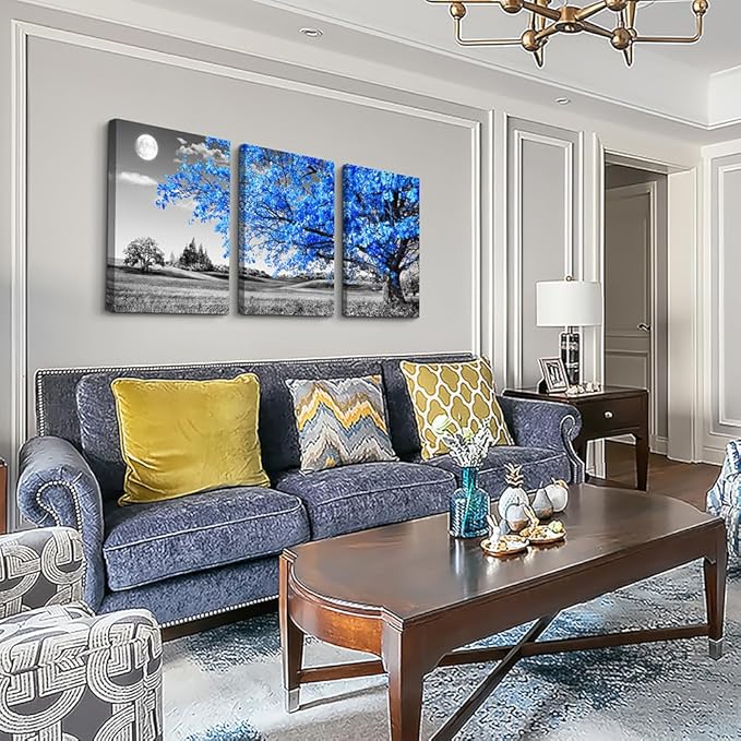 DZRWUBHS Canvas Wall Art For Living Room Modern Wall Decor For Office Black And White Blue Tree Wall Painting Scenery Wall Pictures Artwork For Bedroom Room Home Decor Prints Art 16" X 24" 3 Piece