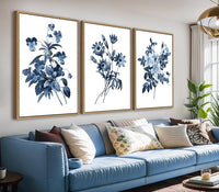 Large Framed Canvas Wall Art - Natural Float Framed Indigo Flowers Picturtes for Living Room Decor Retro Blue Floral Botanical Artwork Plants for Bedroom Kitchen Home Office Decor 72" X 36" Set of 3