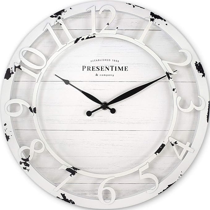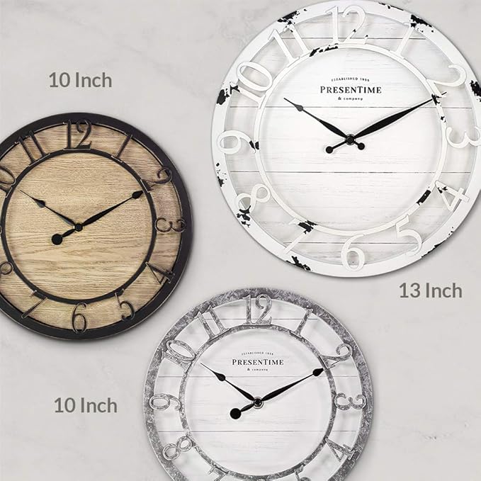 Presentime & Co 13" Farmhouse Series Wall Clock, Quartz Movement, Shiplap Style, Raised 3D Arabic Numeral, Antique Distressed White