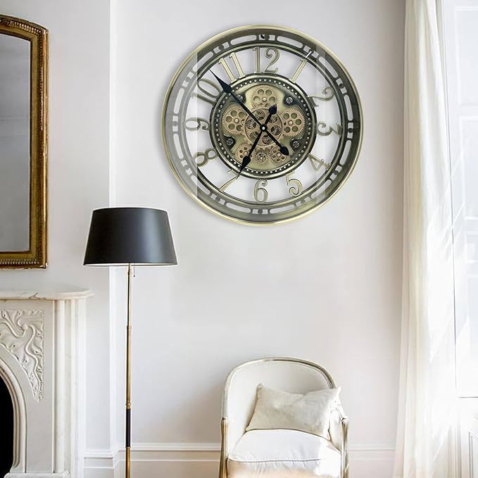 Real Moving Gears Wall Clock Large Modern Metal Clocks for Living Room Decor, Industrial Steampunk Unique Vintage Rustic Decorative Clock for Home Farmhouse Office, 21 Inch,Bronze Gold Arabic