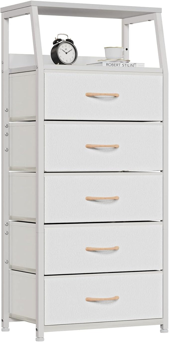 Furnulem White Dresser with 5 Drawers, Vertical Storage Tower Fabric Dresser for Bedroom, Hallway, Entryway, Nursery, Closet Organizer, Nightstand Bedside Table Furniture, Sturdy Steel Frame, Wood Top
