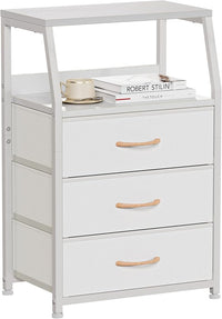 Furnulem White Nightstand with 3 Drawers and 2-Tier Shelf, Small Night Stand End Table Side Furniture, Fabric Storage Organizer for Bedroom, Closet, Hallway, Nursery, Sturdy Steel Frame, Wood Top