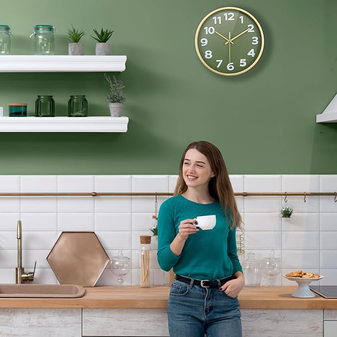 Wall Clock, 10 Inch Silent Wall Clocks Battery Operated, Modern Non-Ticking Analog Clock Decorative for Kitchen Bedroom Office Bathroom- Olive Green and Gold