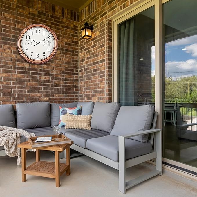 ✔Outdoor Wall Clock. Vigorwise outdoor wall clock measures 12” diameter. Concise numbers against beige clock face makes it easy to read. It's great for mounting to patio.