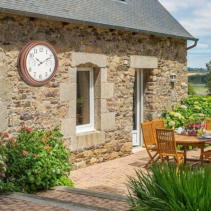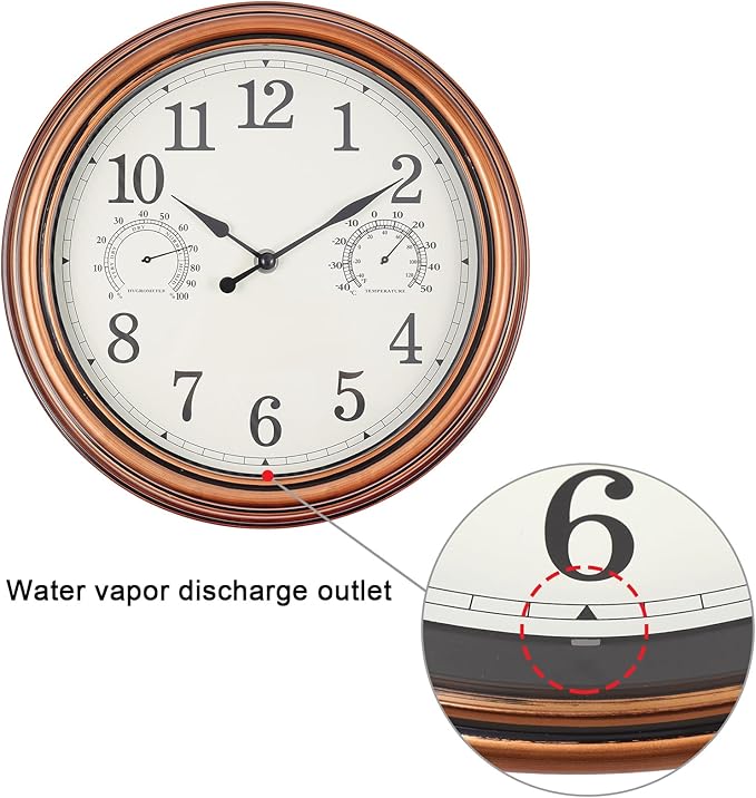 ✔Analog Thermometer & Hygrometer. The waterproof clock has build-in analog thermometer & hygrometer. Automatically measures indoor and outdoor temperature & humidity without adjustment.