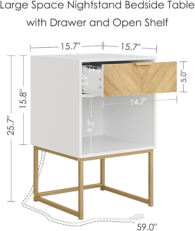 Masupu Extra Large Nightstand with Charging Station,Boho Night Stand Modern Farmhouse Wood Bedside Table with Storage Drawer and Open Shelf,Side End Table for Bedroom,Living Room,Office White