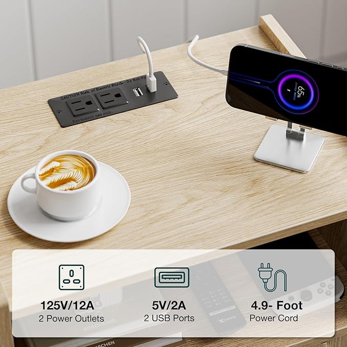 Side Table with Charging Station, Modern End Table with Fluted Drawer, Bedside Table, Night Stand with 2 Tiers Storage Space, for Bedroom, Living Room, Oak