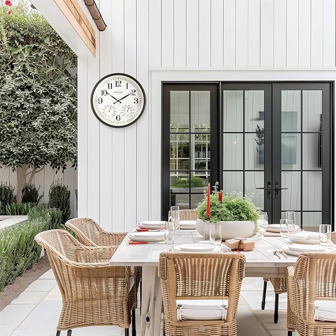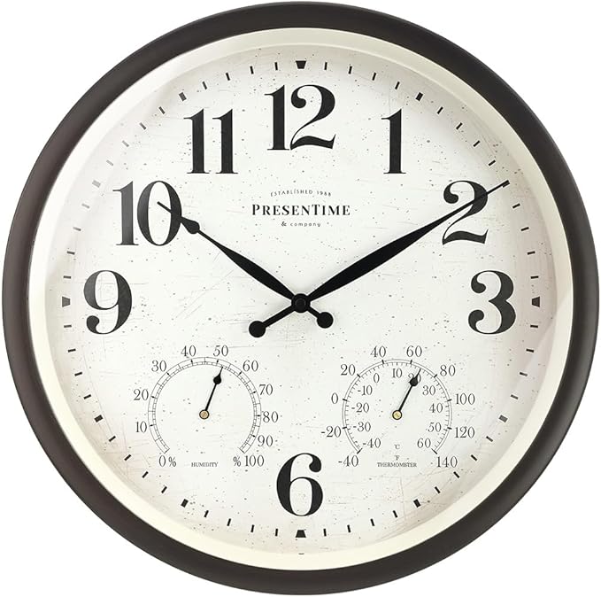 Presentime & Co 16" Farmhouse in/Outdoor Clock, Wall Clock & Weather Station, Weather Thermometer, Wall Décor and Timepiece for Farmhouse Decoration, Oil Rubbed Bronze Finish