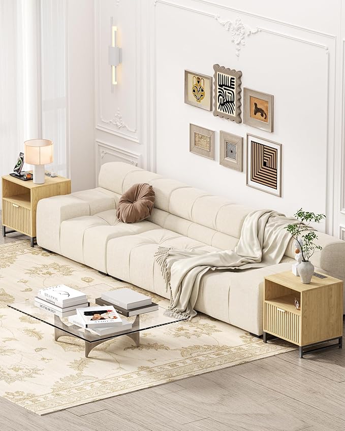 Fluted Night Stand Set 2 with Charging Station, Wood Nightstand with Large Drawer and Open Storage Cabinet, Mid-Century Modern Bedside Table End Table for Bedroom Closet Office