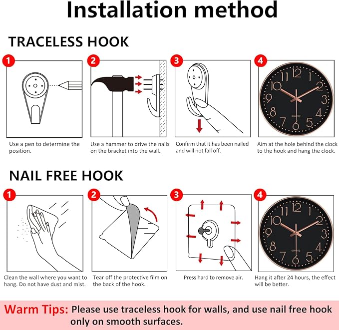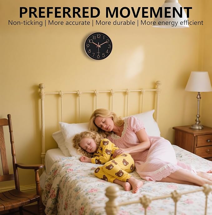 Silent Wall Clocks Battery Operated 8 Inch, Analog Wall Clock with Oversized Number Tempered Glass Clock Face, Non Ticking Wall Clocks for Living Room Bedroom Kitchen Office, Black Rose Gold
