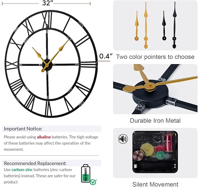 Large Wall Clock for Living Room Decor – 32 Inch Silent Non-Ticking Modern Farmhouse Wall Clock, Oversized Decorative Metal Roman Numeral Clock