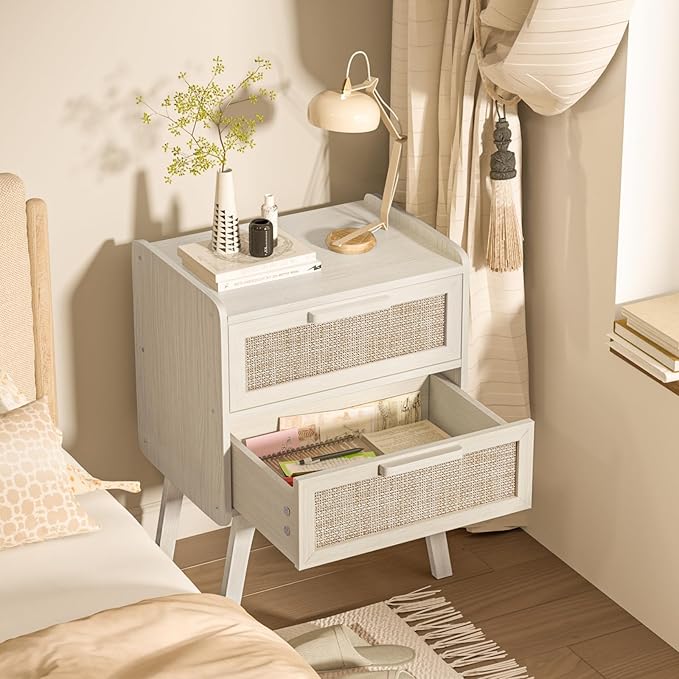 Lerliuo Rattan Nightstand, Boho Night Stand with 2 Drawers, Cane Accent Side End Table, Bedside Table with Solid Wood Legs for Bedroom, Dorm and Small Spaces (White)