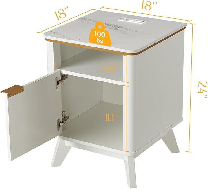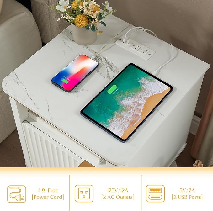 QUW Fluted Nightstand Set of 2 with Charging Station, 18" Modern Side Table, Bedside Table with Open Storage and Cabinet, End Table for Bedroom, Living Room, White