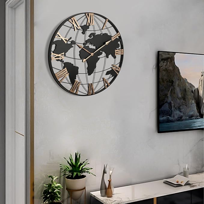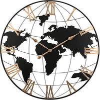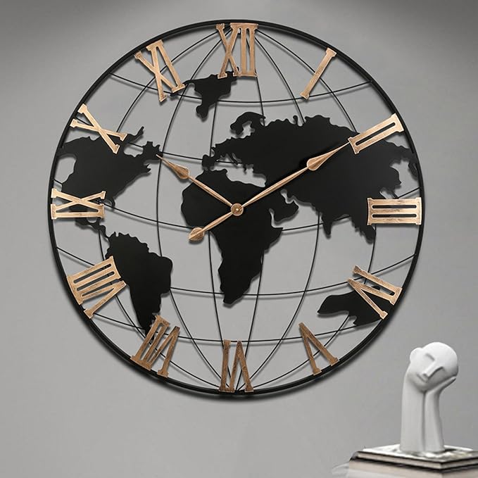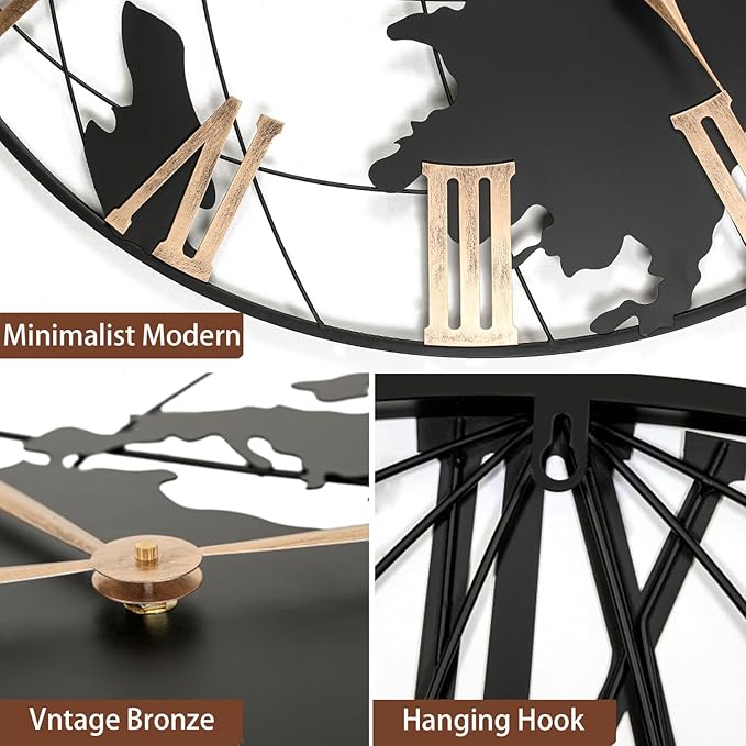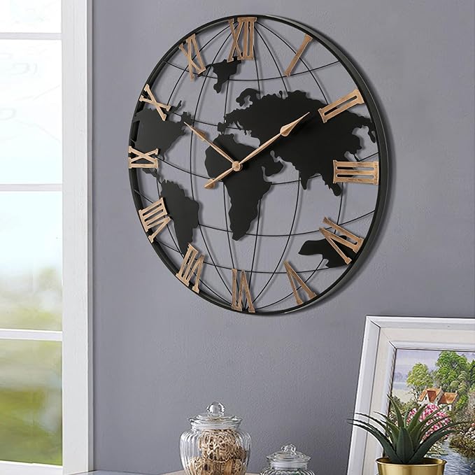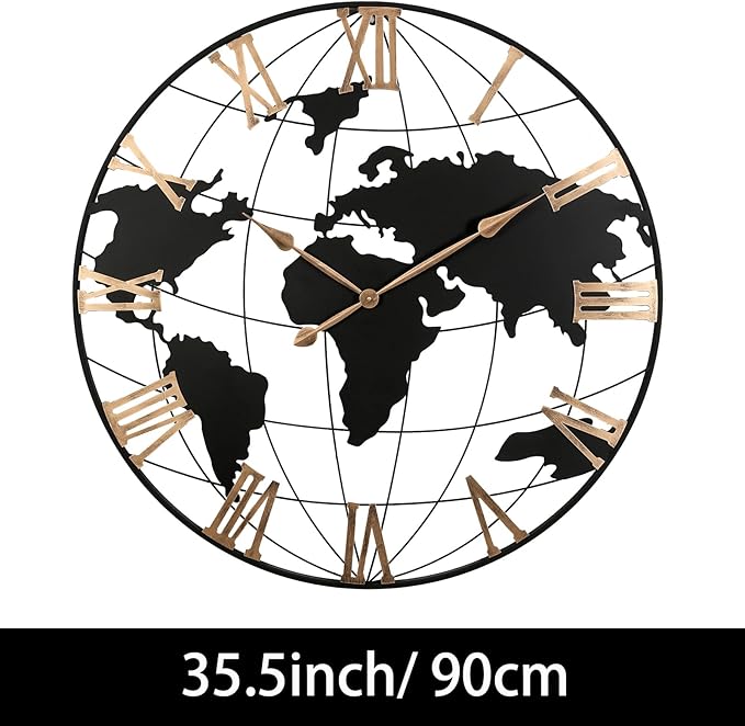 36 Inch Extra Large World Map Wall Clock, Retro Minimalist Silent Non-Ticking Battery Operated Clock for Living Room, Bedroom, Office, Kitchen, Black Roman Numerals