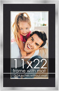 11x22 Frame with Mat - Silver 13x24 Frame Wood Made to Display Print or Poster Measuring 11 x 22 Inches with Black Photo Mat