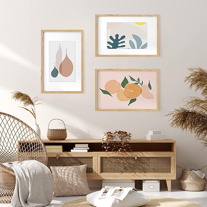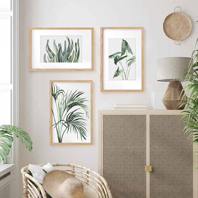 11x17 Picture Frame Set of 3, Solid Oak Wood Photo Frame 11"x17", 11 by 17 Poster Frames for Wall, 11 x 17 Frame with Mat for 8 x 12, Tempered Real Glass, 11x17 Inch Wood Frame (Oak Color, 3 Pack)