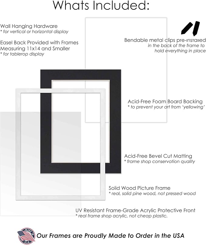 11x11 Frame with Mat - White 14x14 Frame Wood Made to Display Print or Poster Measuring 11 x 11 Inches with Black Photo Mat