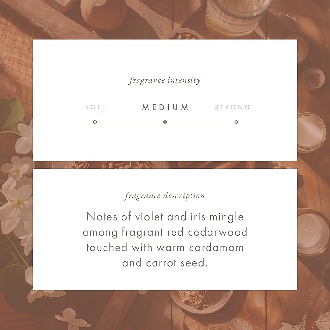 THE FRAGRANCE: Santal & Red Cedar features notes of violet and iris mingle among fragrant red cedarwood touched with warm cardamom and carrot seed.